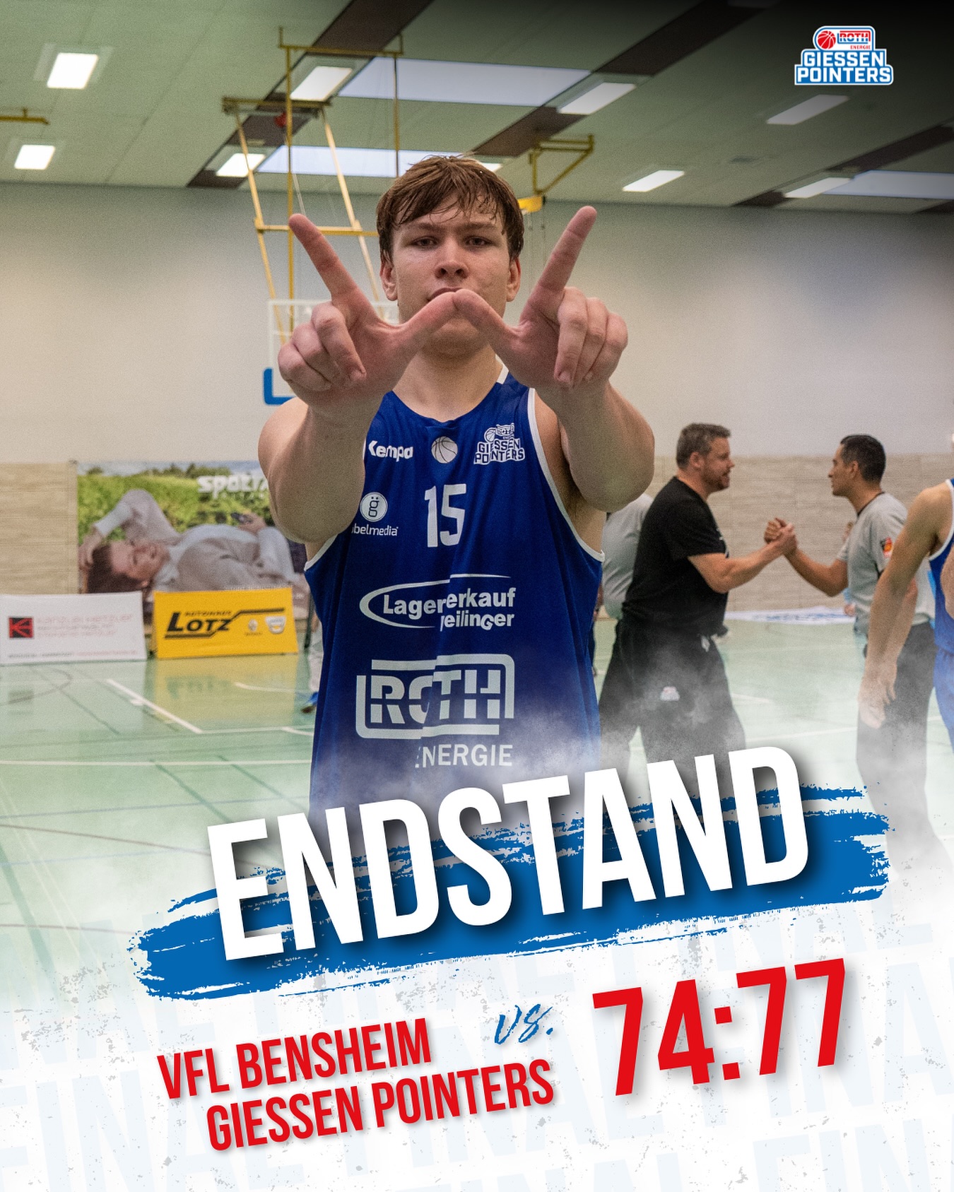 (cnf). Gelungener Saisoneinstand für die Gießen Pointers - und für ihren neuen Headcoach Tobias Bender: Am ersten Spieltag der 1. Basketball-Regionalliga Südwest setzten sich die Mittelhessen nach einem wilden Auf und Ab beim VfL Bensheim mit 77:74 (67:67) nach Verlängerung durch. Zur Pause noch mit elf Zählern hinten (22:33), drehte Gießen die Partie nach dem Seitenwechsel, ließ die Gastgeber dennoch wieder herankommen - und entschied die Overtime dank starker Moral für sich.