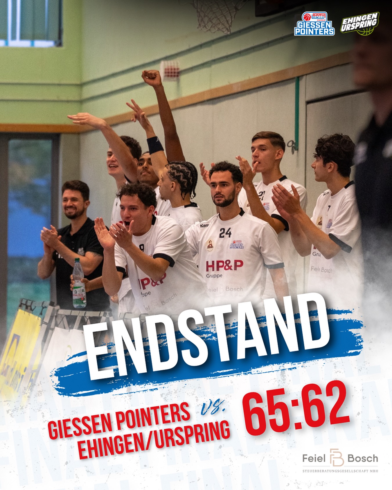 (cnf). Nach der ersten Saisonniederlage in der Vorwoche haben sich die Gießen Pointers eindrucksvoll zurückgemeldet. Am dritten Spieltag der 1. Basketball-Regionalliga Südwest bezwang das Team von Headcoach Tobias Bender das Team Ehingen/Urspring mit 65:62 (36:32) und feierte damit den zweiten Saisonsieg.