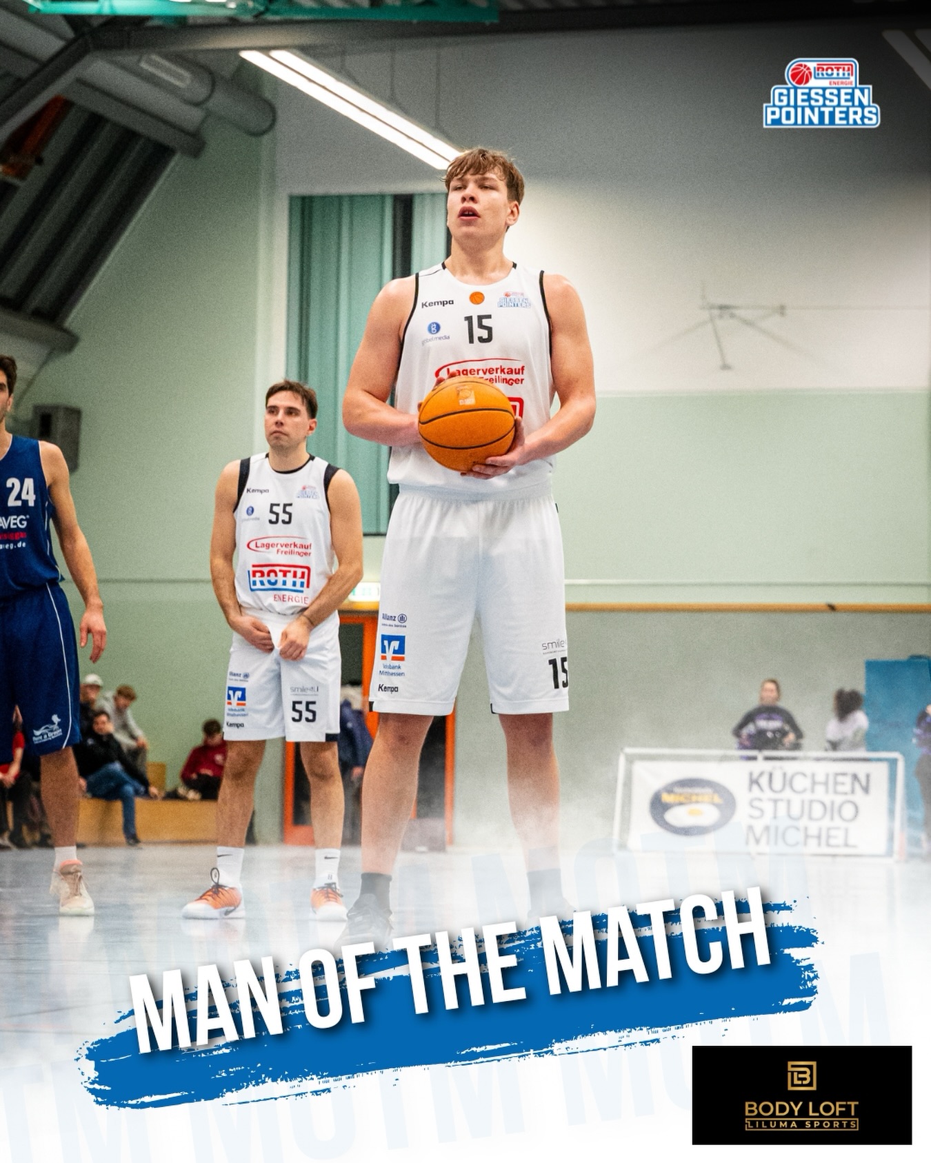30 Punkte, elf Rebounds und eine Trefferquote von über 65 Prozent aus dem Feld – der Auftritt von Kai Müsse beim 93:78-Heimsieg der Gießen Pointers gegen den VfL Bensheim war dominant, reif und spielentscheidend. Der 19-Jährige prägte die Partie unter den Körben wie kein Zweiter und hatte maßgeblichen Anteil am sechsten Sieg der Pointers in Folge. Die Auszeichnung zum Sportler der Woche ist damit folgerichtig.
